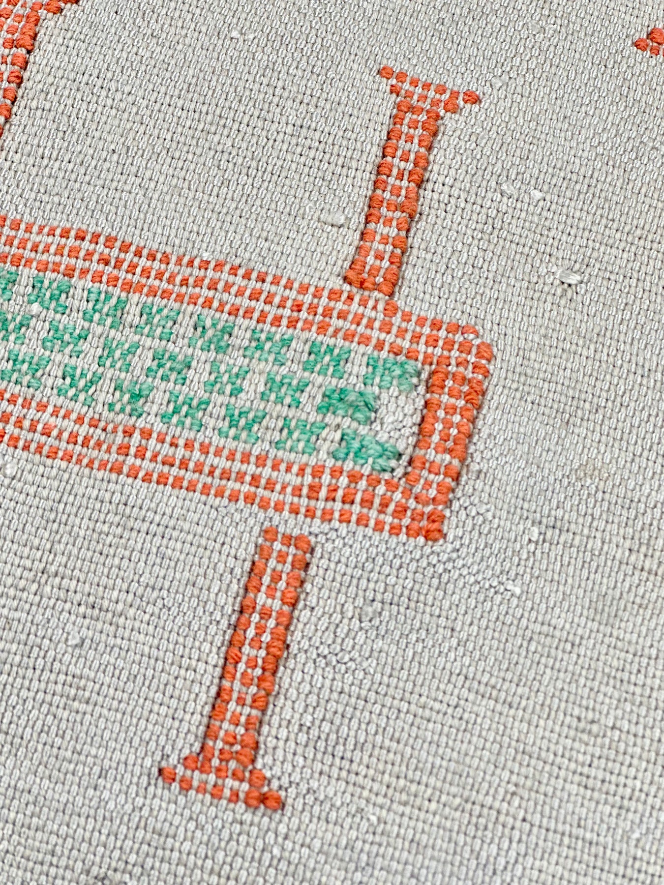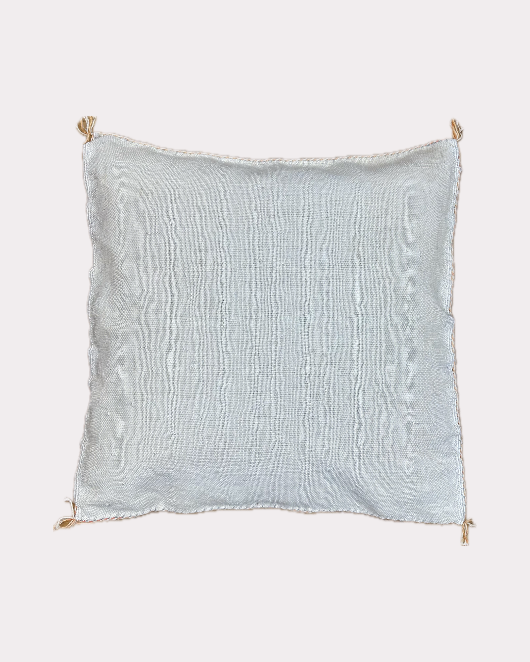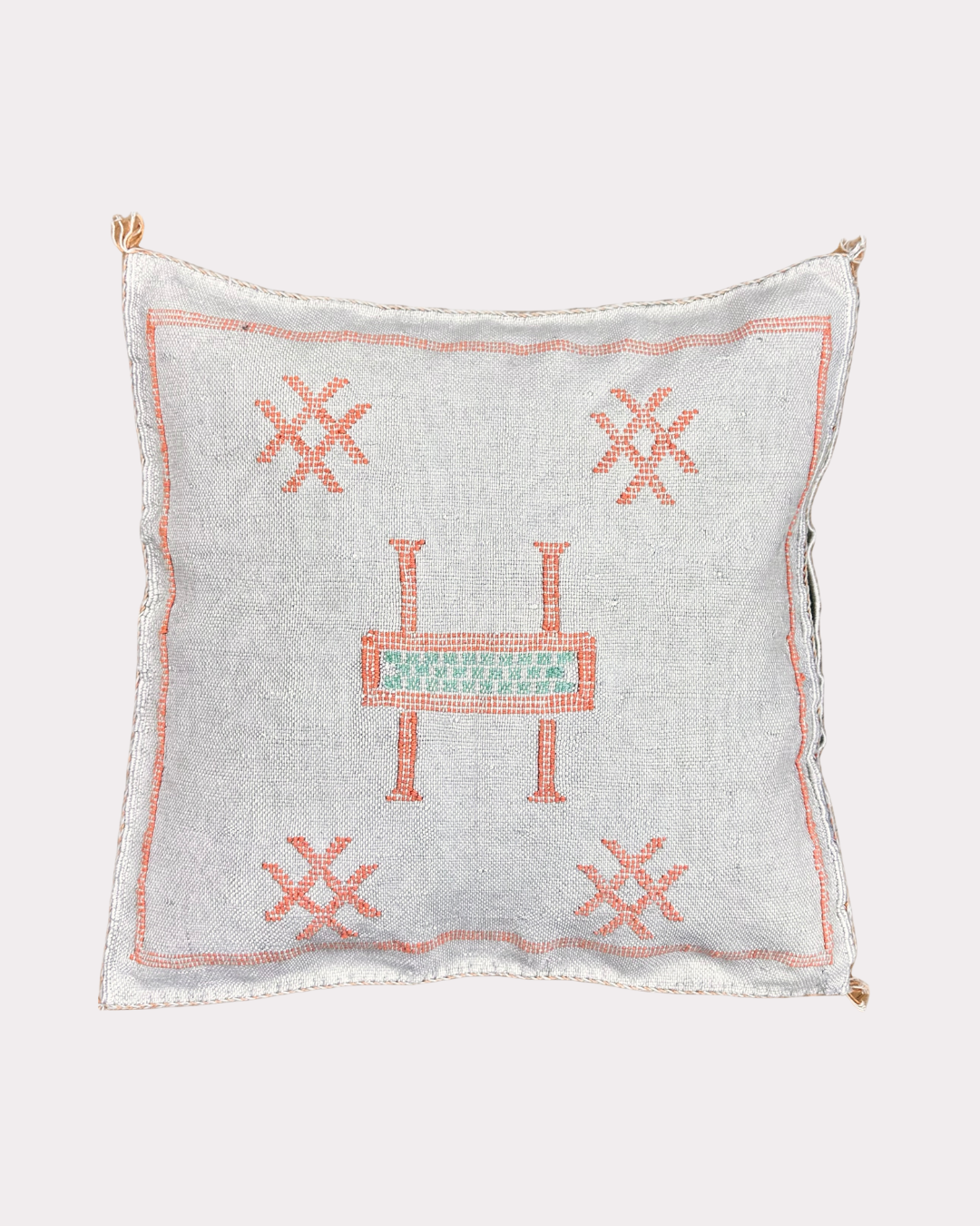 Dieses handgefertigte Kissen aus echter Kaktusseide (Sabra) ist ein stilvolles Unikat aus traditioneller marokkanischer Handwerkskunst. Die fein schimmernde Naturfarbe wird durch zarte korallfarbene Berber-Symbole und ein geometrisches Mittelmotiv ergänzt – dezent, elegant und zeitlos zugleich.