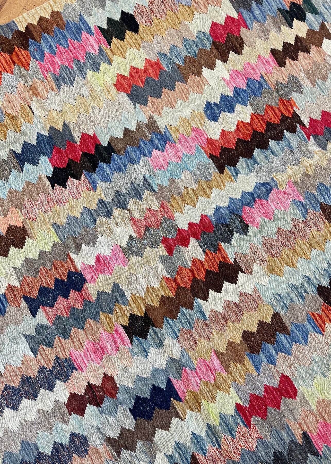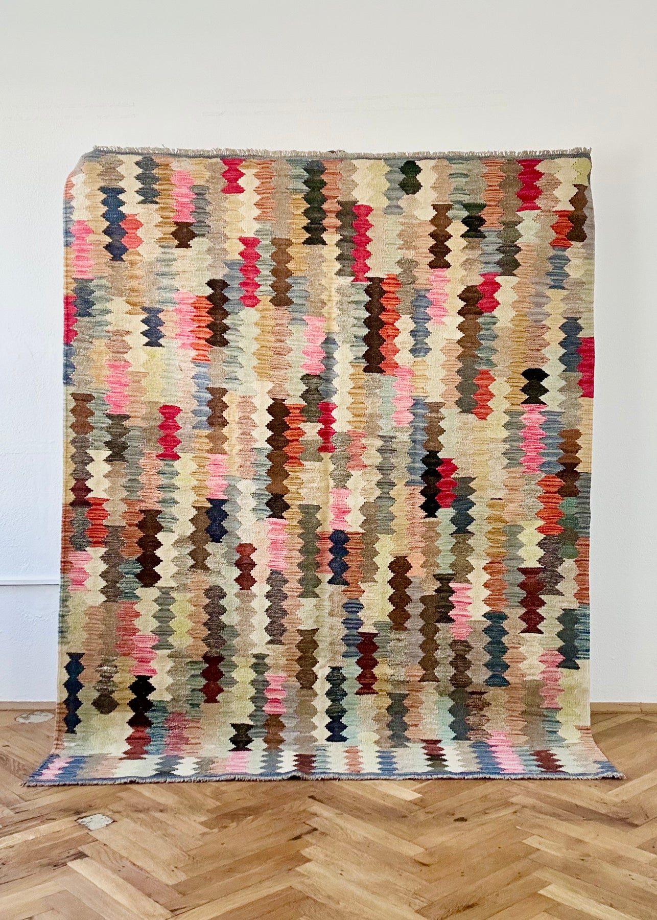 Die ausdrucksstarken Ornamente und warmen, lebendigen Farbtöne verleihen jedem Raum sofort eine besondere Atmosphäre. Ob im Wohnzimmer, im Essbereich, im Schlafzimmer oder im Flur – dieser Kelim bringt Wärme, Persönlichkeit und stilvolle Tiefe in dein Zuhause.