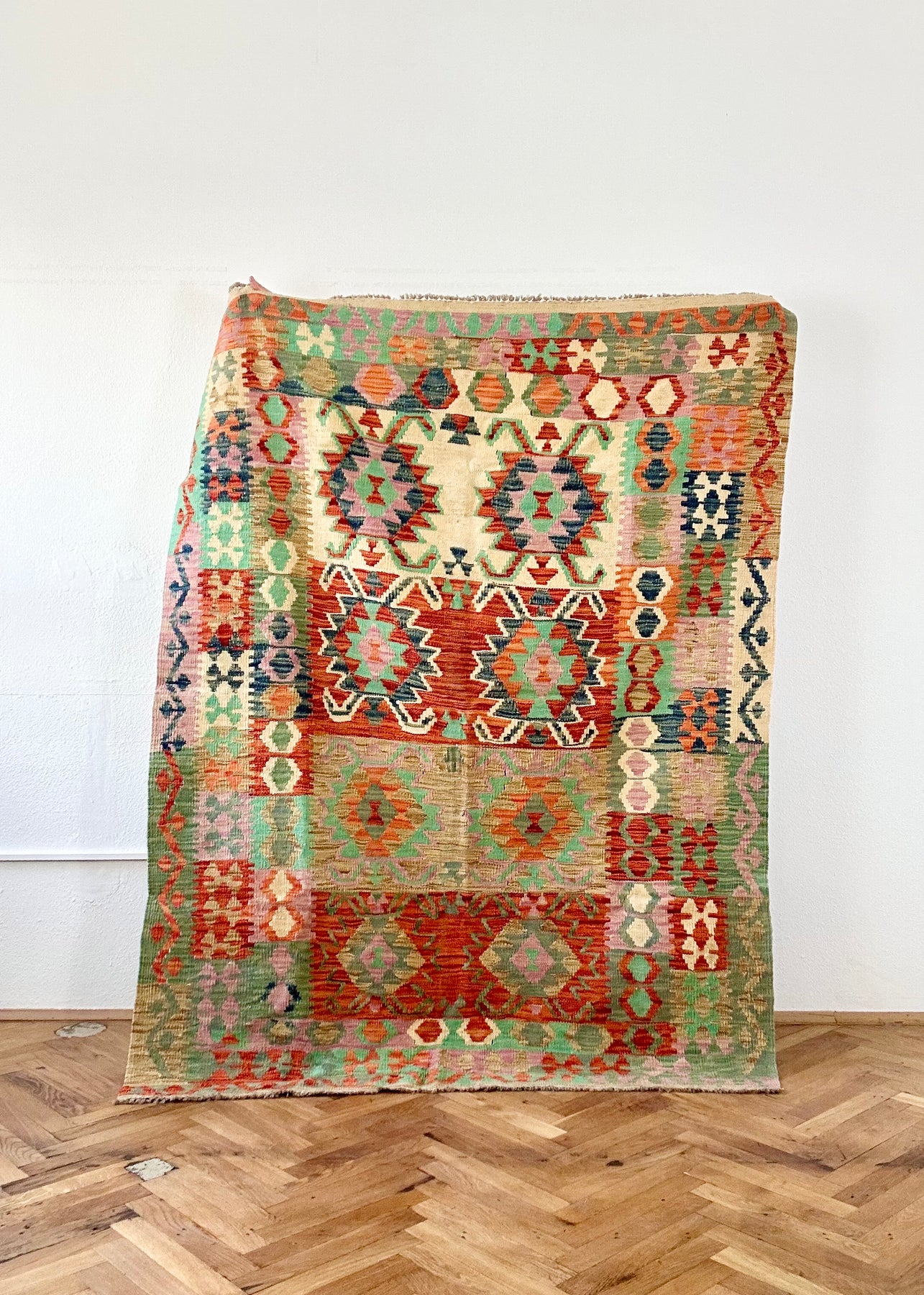 Unser afghanischer Kelim Teppich ist aus 100% Schurwolle handgefertigt und stammt aus der traditionellen Handwerkskunst Afghanistans. Jeder Teppich ist ein Unikat und besticht durch seineeinzigartigen Muster und lebendigen Farben. Hergestellt aus hochwertiger Wolle und mit viel Liebe zum Detail gefertigt, ist dieser Kilim Teppich nicht nur ein dekorativesElement, sondern auch ein Stück Geschichte und Kultur. Bring mit diesem handgewebten Kelim Teppich einen Hauch von zeitloser Eleganz in dein Zuhause.