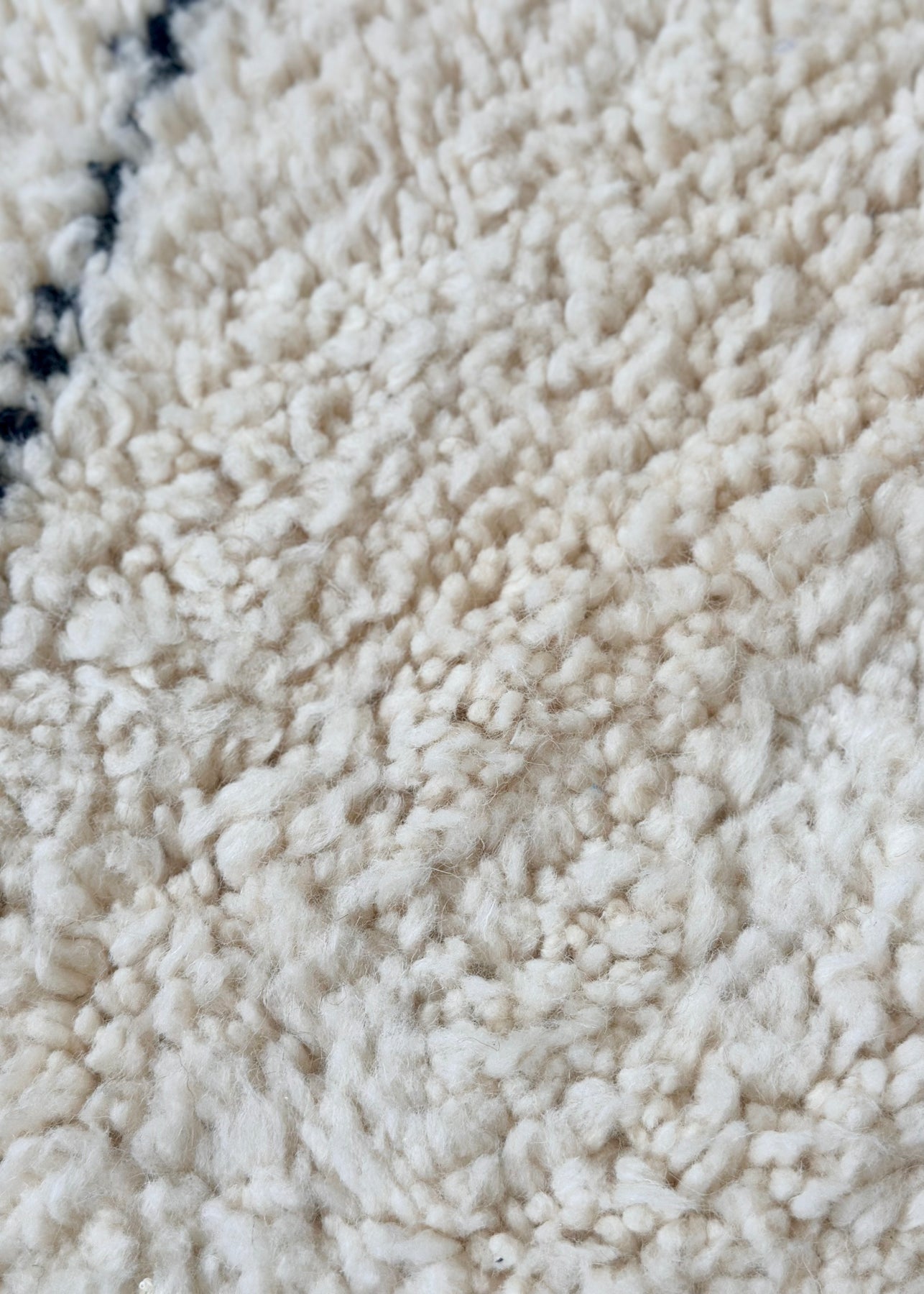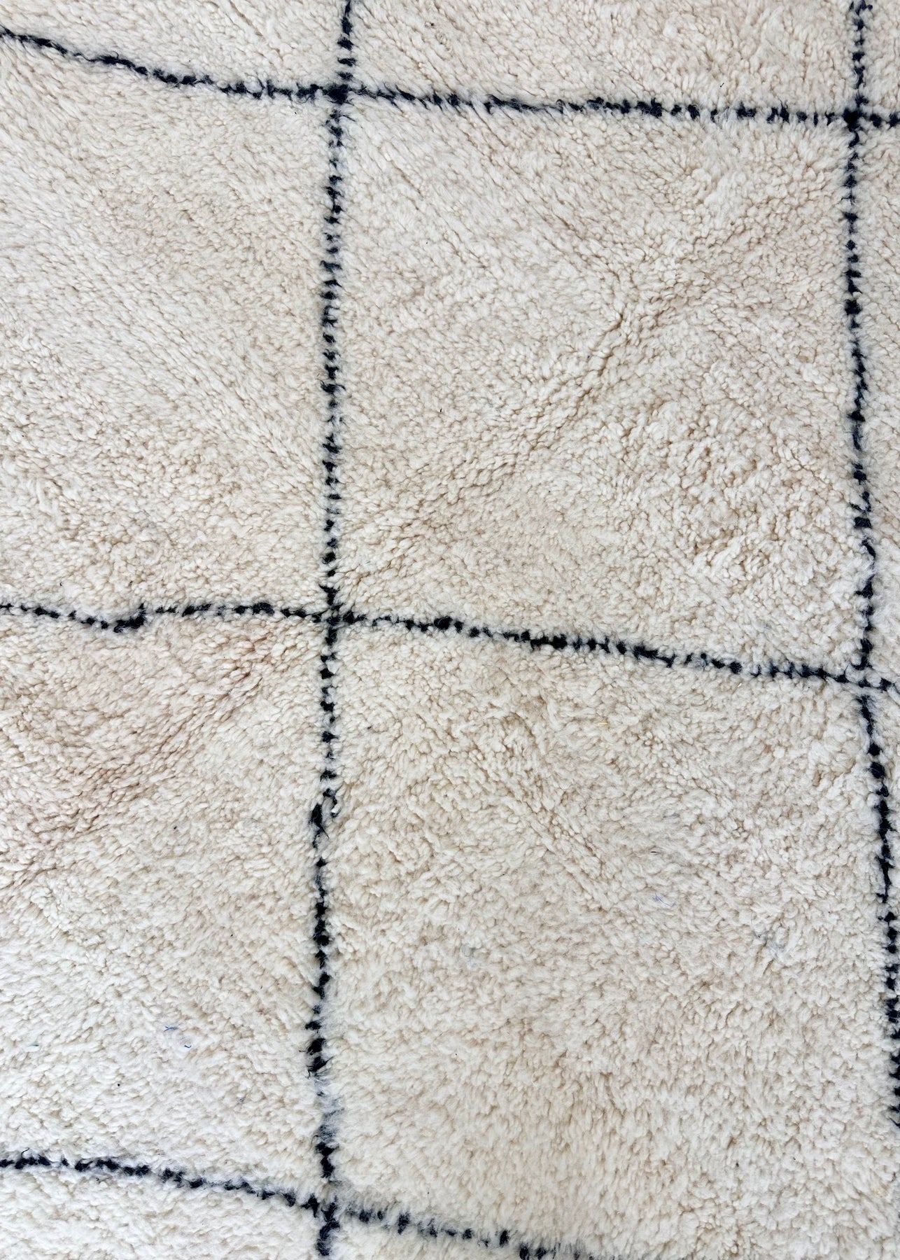 The minimalist diamond pattern of the Amazigh rug , crafted in black wool on a light wool background, lends it a calm, graphic effect. As a classic Beni Ourain rug, it impresses with its soft surface, natural warmth, and high durability.
