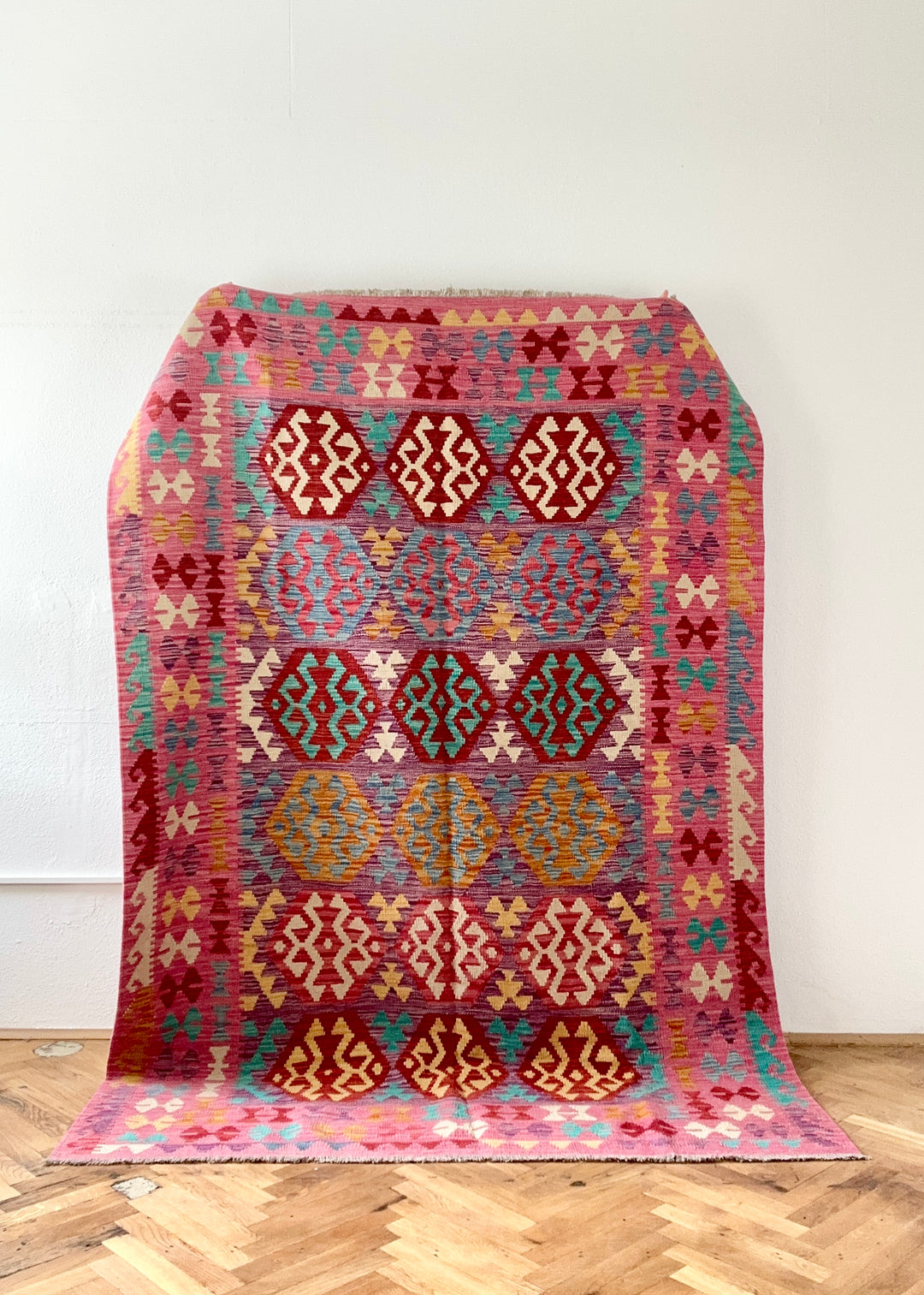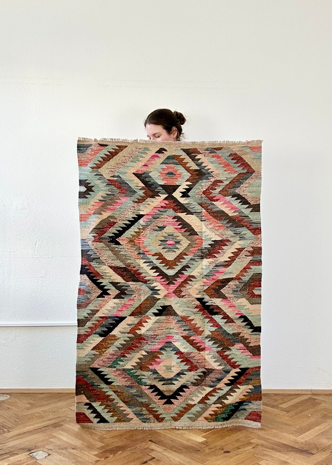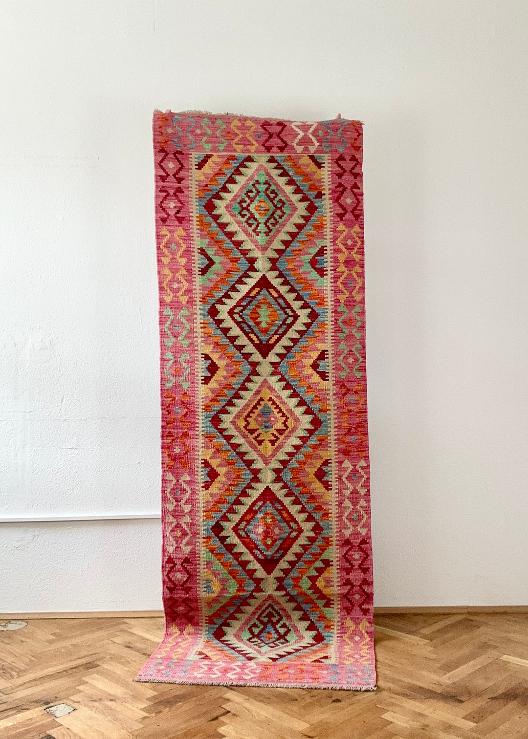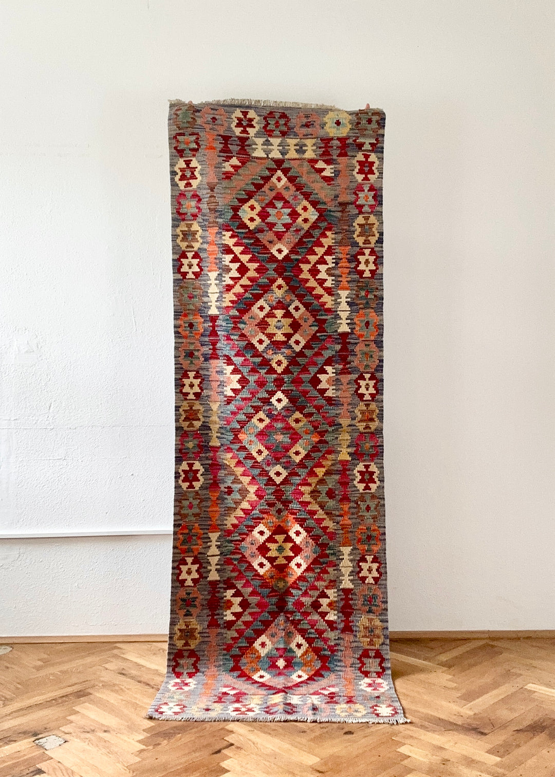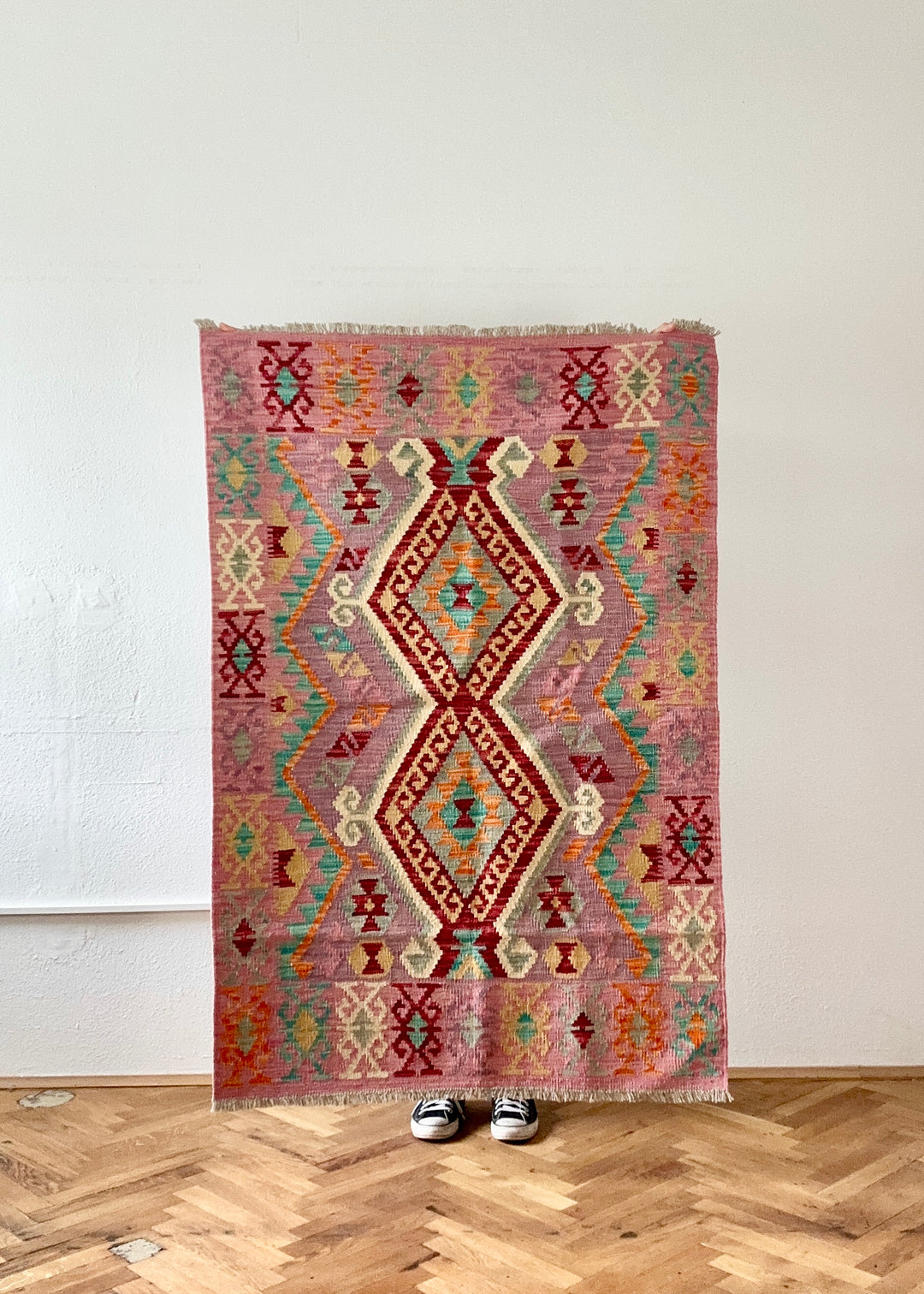 Las alfombras Kilim o Kilim están experimentando actualmente un gran regreso. La versatilidad y combinabilidad de los kilims con los estilos de vida modernos garantizan que este tipo de alfombra atraiga a muchos gustos. Algunas de las alfombras kilim son muy coloridas y varían en color desde rojo, naranja, marrón, azul, verde o turquesa. Otras alfombras de estilo kilim son más discretas en negro, gris, marrón o beige. Los kilims combinan patrones y materiales clásicos con muebles modernos. Este tipo de alfombra es atemporal y moderna. El kilim tiene una larga tradición en Oriente y originalmente fue fabricado para el uso personal de los nómadas. De este modo, cada uno de nuestros kilims transporta una pieza de artesanía tradicional a través de Berlín directamente a un nuevo hogar. Una alfombra kilim puede transformar una habitación. Un kilim se puede utilizar como elemento de diseño en relación con la arquitectura u otro diseño de interiores. Un juego de forma y color, que ofrece puntos de contacto de diseño en muchos aspectos, caracteriza las alfombras Kelim. Mientras que los patrones geométricos en un kilim, por ejemplo, pueden retomar elementos de construcción modernos, una alfombra de color mar de turquesa y naranja puede crear acentos maravillosos entre el hormigón expuesto en gris. La artesanía era y es moderna y encuentra una expresión tradicional en un kilim de The Knots de Berlín, la combinación de vintage y futuro. Con un kilim, cualquier salón, ya sea en Berlín o en cualquier otro lugar, se puede transformar en un pequeño oasis de Oriente.
