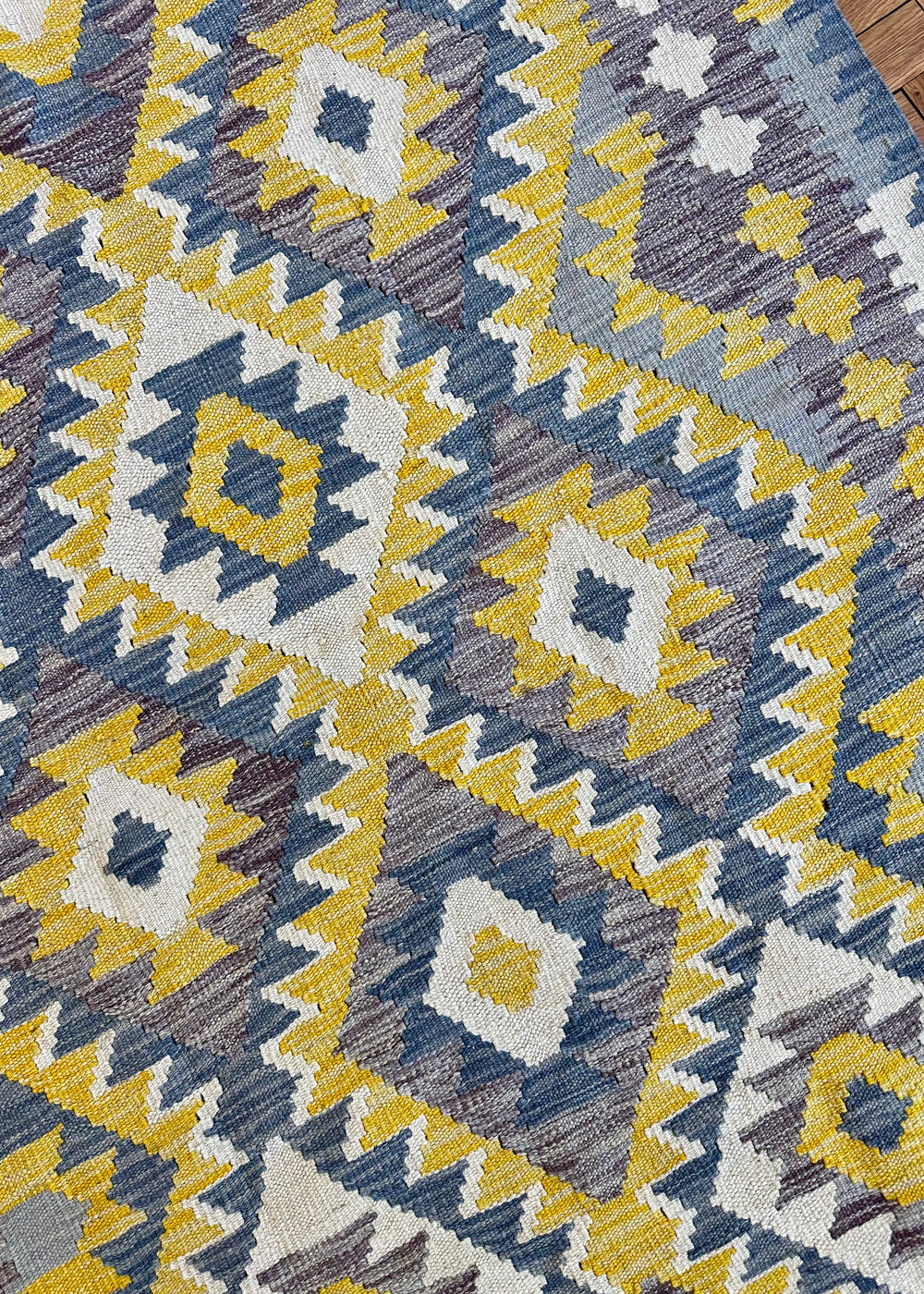 Esta alfombra kilim afgana es una auténtica obra maestra de la artesanía tradicional. Fabricada con 100% lana virgen de alta calidad, cada alfombra está cuidadosamente hecha a mano con gran dedicación. Los patrones únicos y colores vibrantes hacen que cada pieza sea única, cautivando no solo por su belleza visual sino también por su significado cultural. Esta alfombra Kilim aporta una elegancia atemporal a su hogar y le da a su habitación un pedazo de la historia y cultura afganas. Ideal para añadir un carácter elegante y acogedor a cualquier habitación.